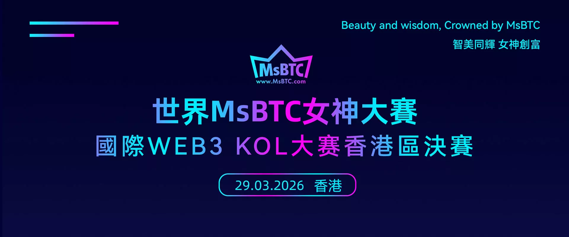 為進一步發展數字經濟,同時展現WEB3 KOL在數字經濟領域的獨特魅力與智慧,激發行業創新活力,促進行業合作發展,增强公眾對WEB3的理解與信任,亞洲區塊鏈學會、WBA世界區塊鏈聯盟、WMA世界元宇宙發展聯盟共同舉辦“世界MsBTC女神大賽暨國際WEB3 KOL大賽”。 活動旨在打造一個高端、公正、富有影響力的Web3選美賽事平臺,選拔才貌雙全、充滿自信、積極向上的數字經濟新時代女性代表。 宣導美麗與智慧並存,內在與外在兼修,並以此推廣數字經濟文化與公益理念。 大賽將在每個國家/地區舉辦分賽區決賽,2026年在美國進行全球總決賽。