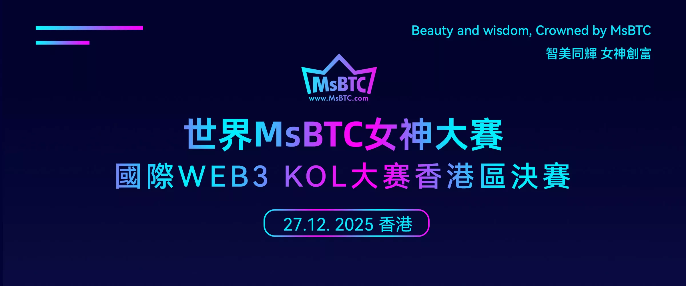 為進一步發展數字經濟,同時展現WEB3 KOL在數字經濟領域的獨特魅力與智慧,激發行業創新活力,促進行業合作發展,增强公眾對WEB3的理解與信任,亞洲區塊鏈學會、WBA世界區塊鏈聯盟、WMA世界元宇宙發展聯盟共同舉辦“世界MsBTC女神大賽暨國際WEB3 KOL大賽”。 活動旨在打造一個高端、公正、富有影響力的Web3選美賽事平臺,選拔才貌雙全、充滿自信、積極向上的數字經濟新時代女性代表。 宣導美麗與智慧並存,內在與外在兼修,並以此推廣數字經濟文化與公益理念。 大賽將在每個國家/地區舉辦分賽區決賽,2026年在美國進行全球總決賽。
